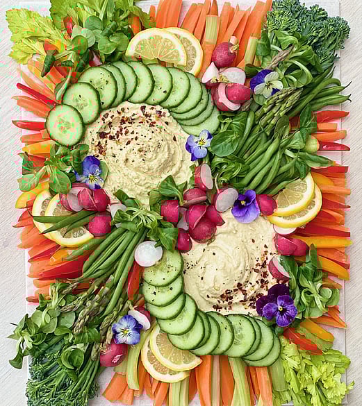 Fresh seasonal vegetable crudités served with your choice of two dips