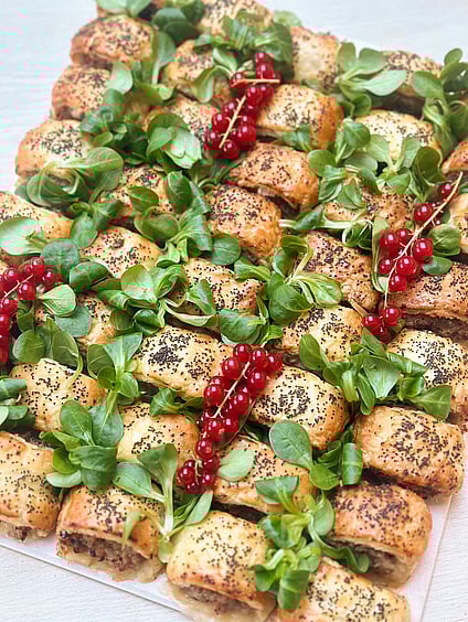 40 of our (very, VERY popular!) red onion and sage homemade sausage rolls with edible garnish.